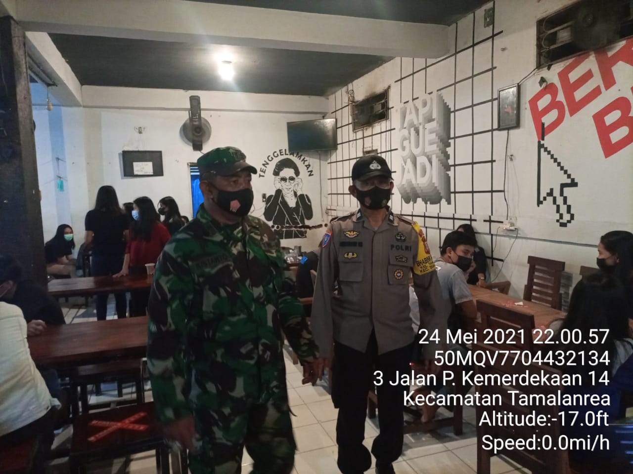 Seperti yang terlihat, personel gabungan Tim satgas Raika yang terdiri dari Polsek Tamalanrea, Babinsa dan Satpol PP melakukan patroli pendisiplinan protokol kesehatan (protkes) di cafe, warkop dan pusat keramaian Wilayah Tamalanrea, Senin (24/5/2021) malam.